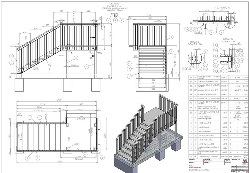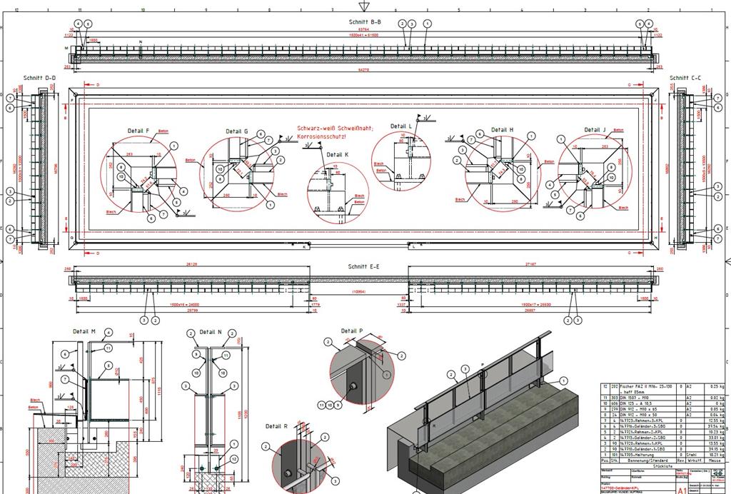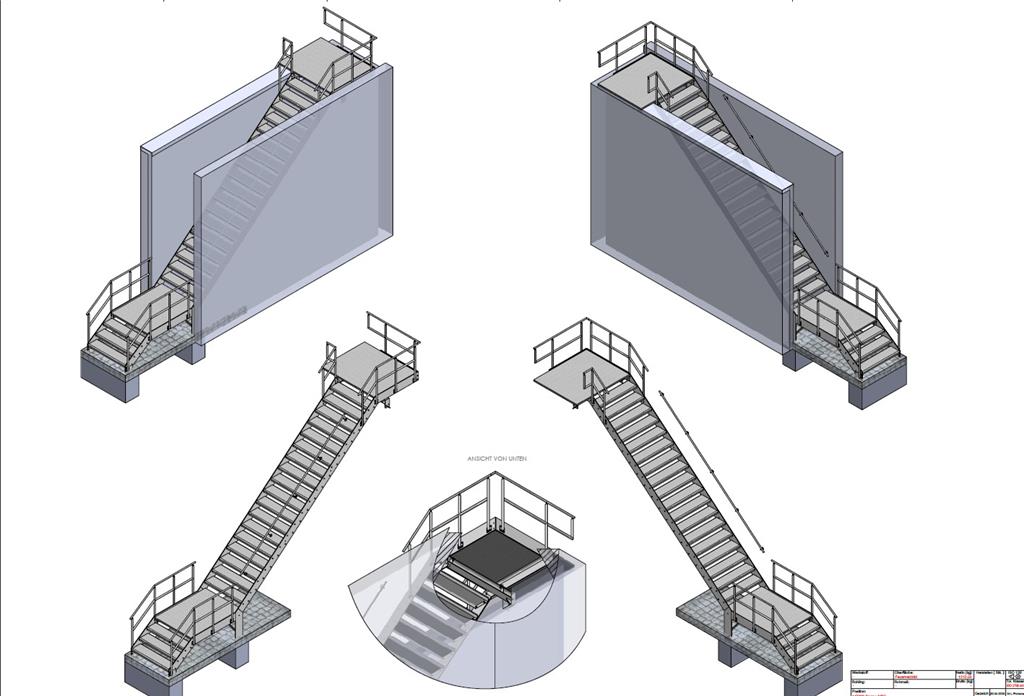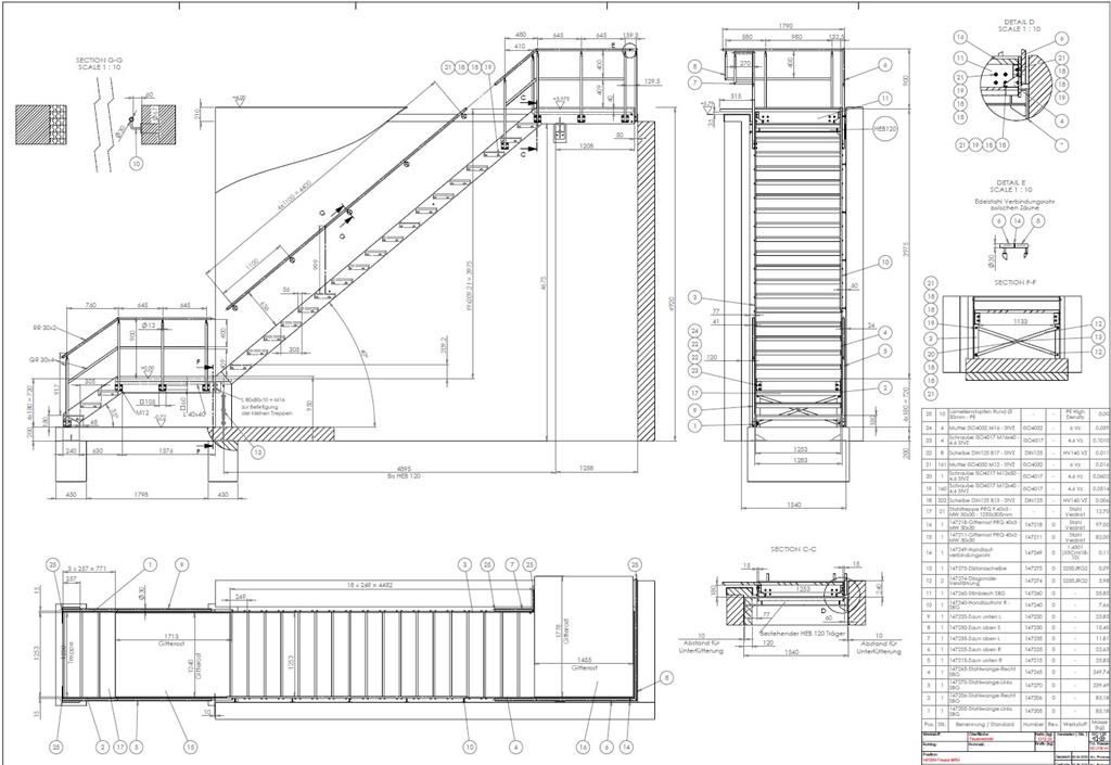 Anfertigung von technischen Zeichnungen für Treppen, Treppen, Geländern und Hallen der Basis statistischer Berechnungen.
